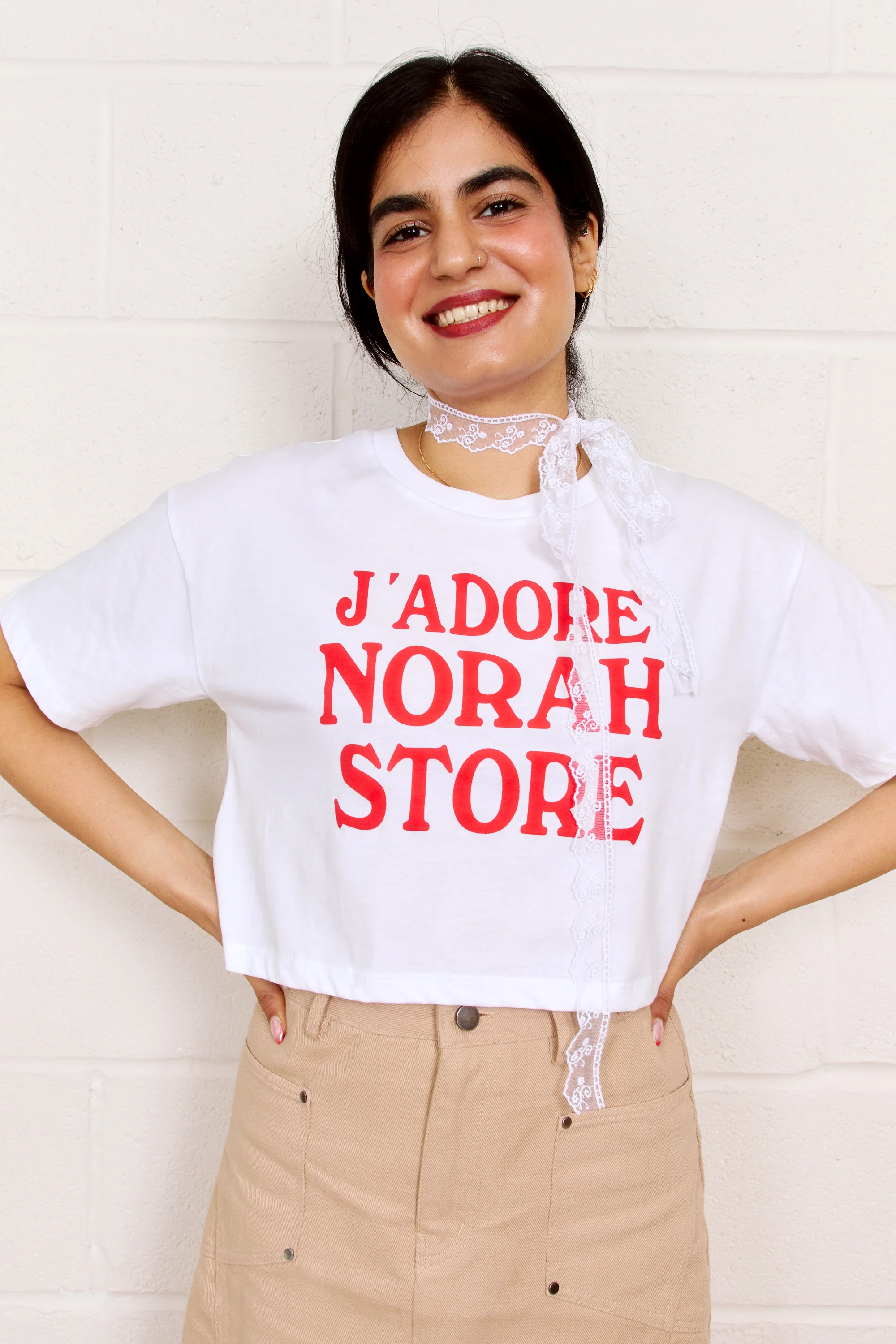 Declare your love for us proudly and truly in this super soft boxy organic cotton T shirt emblazoned with J'ADORE NORAH STORE in our signature Legacy Red